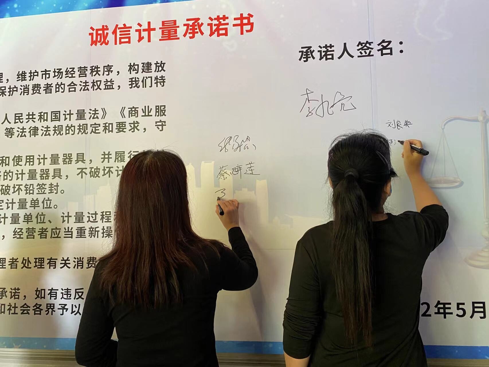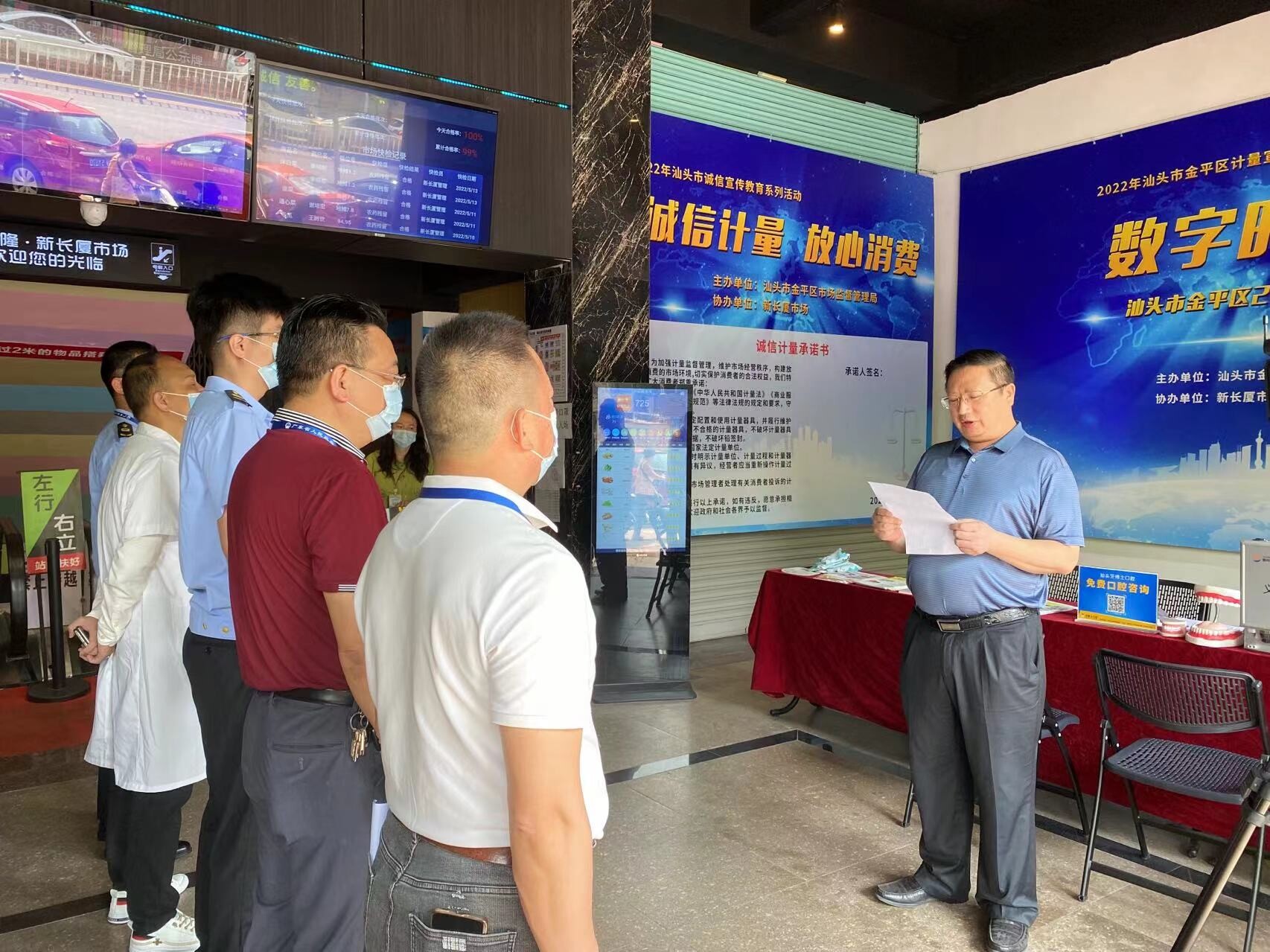 活动中,张宏同志就“推进计量数字化转型、服务数字中国建设”和“诚信计量、放心消费”作了讲话。张宏同志指出,民生计量无小事,诚信计量关系到我们老百姓的生活质量和切身利益,需要全社会共同参与。集贸市场、超市、医疗机构等负责人要履行好主体责任,广大经营户要树立诚信意识,拒绝计量作弊行为。我们也将加大对违法违规行为的查处力度,增加违法违规行为的经营成本。市场负责人和商户代表表示,将自觉遵守法律法规,营造放心消费的市场环境,随后大家在“诚信计量承诺书”上签名。
