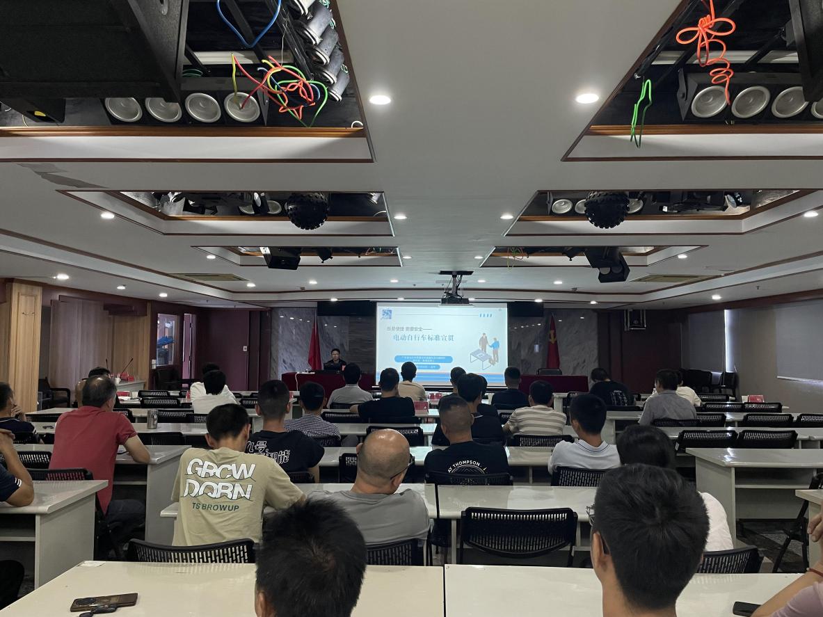 本次培训特邀汕头市质量技术监督标准与编码所洪东旭教授进行授课。洪教授以新版《电动自行车安全技术规范》(GB 17761-2024)标准修订背景为切入点,阐述了新规发布的必要性与现实意义,针对国家标准中的新修订的重要技术指标进行了全面且深入的解读,并结合往年相关的行政处罚案例,提醒在座电动自行销售单位要落实销售单位质量安全主体责任规定,建立风险管控清单,严禁销售非法改装、拼装、篡改的电动自行车。活动还结合“质量月”宣传,播放了《质量强国建设纲要》《广东省质量强省建设纲要》等视频。