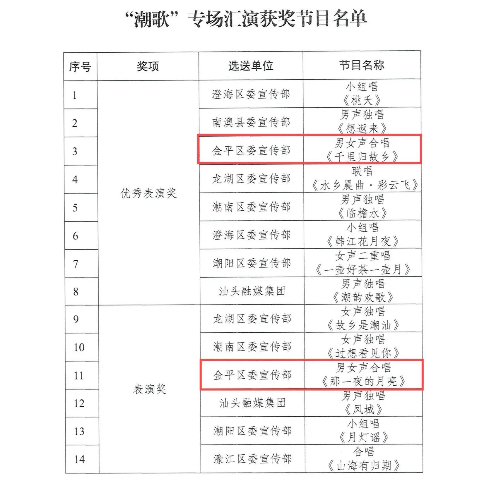 在“潮歌”专场中,由我区选送的男女声合唱《千里归故乡》荣获优秀表演奖,男女声合唱《那一夜的月亮》荣获表演奖。