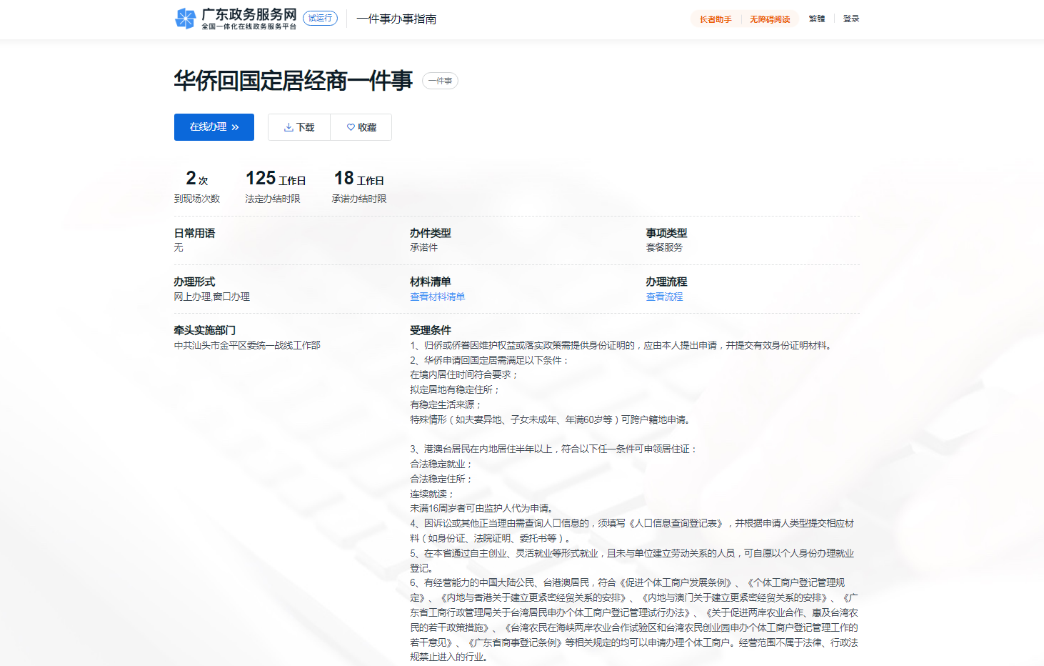 (二)智能导办。依托汕头市一体化政务服务平台,提供智能导办服务。申请人可根据自身实际回答相关问题,系统将根据所选择的业务情形生成动态指南,通过信息化手段将涉及不同部门的多个事项整合为“一件事”,按照“材料一次提交”的要求,对办理材料进行精简、整合去重,避免材料反复交、多次交的问题,让侨胞回乡办事更省心、更省力。