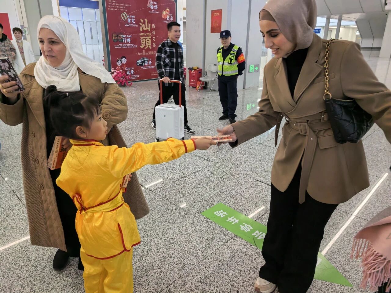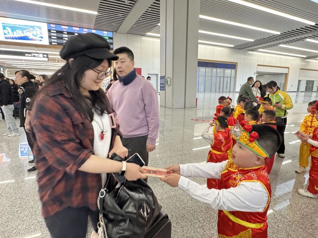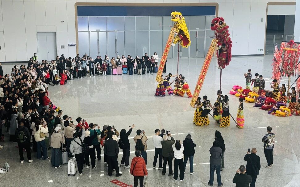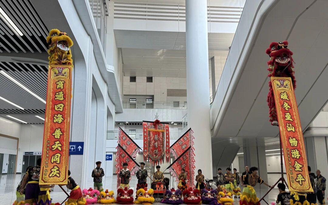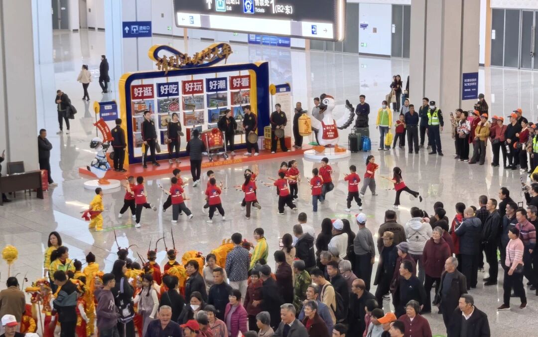 轮番上演的文艺快闪表演,让现场氛围持续升温。金平区月浦街道湖头社区醒狮文化传承协会现场表演《醒狮献瑞》,醒狮时而腾跃时而摆尾眨眼,动作刚劲有力又不失灵动,吉祥寓意随锣鼓声传遍出站广场,引得旅客纷纷驻足喝彩。来自金平区广厦新城幼儿园的小朋友们则化身“萌狮”与“潮童”,将童真与传统碰撞出别样火花。萌龙醒狮队用小巧的身形舞起醒狮,稚嫩童真又气势十足;潮童英歌队动作轻盈整齐,又透着英歌舞的坚定豪迈,成为现场最吸睛的风景线。