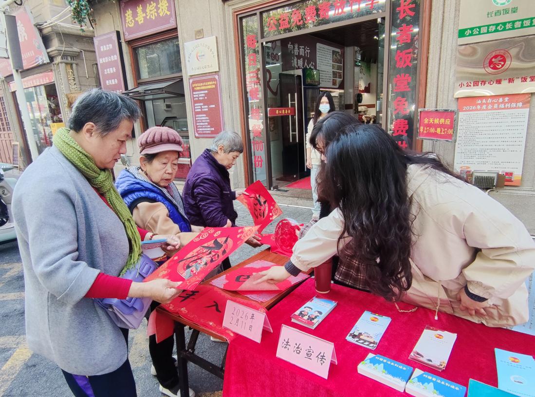 农历腊月二十四当天,在金平区司法局公共法律服务中心小公园存心联络站,区司法局联合存心慈善会开展金平区“法治护航迎新春”主题活动。活动现场设置“法治春联送福”摊位,为群众送上法治春联和福字。工作人员围绕群众关心的法律问题和热点开展法治宣传,为来往游客、群众、存心慈善会会员提供法律咨询,讲解习近平法治思想、涉外法治、道路交通安全、消防安全等法治知识,介绍法律援助、人民调解、公证服务相关工作流程。通过“送春联+法律服务”的模式,以群众喜闻乐见的形式将法治知识送入寻常百姓家。2月10日,光华司法所开展“迎新春、普法律、送春联”主题法治宣传活动,特邀省书法家协会会员现场书写法治春联和福字,以年俗文化为载体传递法治精神。