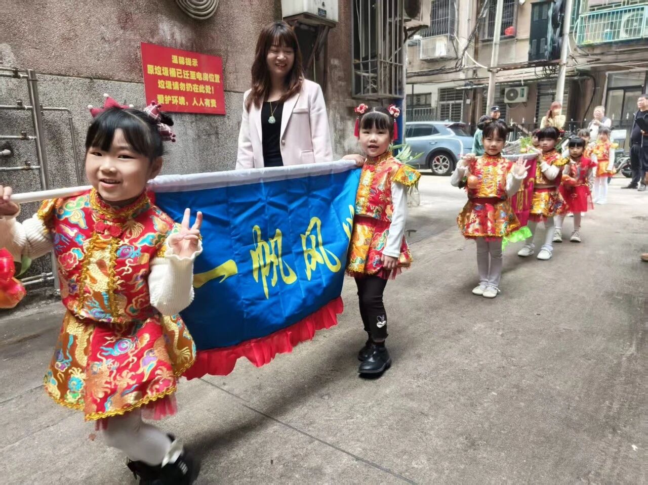 为确保活动顺利进行,滨厦社区“两委”干部全程做好组织协调和安全保障工作,联合园方实地勘查确定游演路线,发动网格员和党员志愿者清理沿途环境、维护现场秩序,并提前入户宣传动员居民参与。在社区党员干部的精心护航下, 活动现场热闹非凡。来自知己圆明幼儿园的40多名小朋友,身着色彩鲜艳的特色戏服,化身为一个个神气十足的“小英歌队员”。在老师的带领下,孩子们踏着激昂的鼓点,挥舞手中短棍,有板有眼地演绎着英歌舞的力与美。稚嫩却认真的脸庞、活泼又灵动的身姿,将这项国家级非物质文化遗产的独特风采展现得淋漓尽致,吸引了周边众多社区居民纷纷驻足观看,现场掌声与喝彩声此起彼伏。