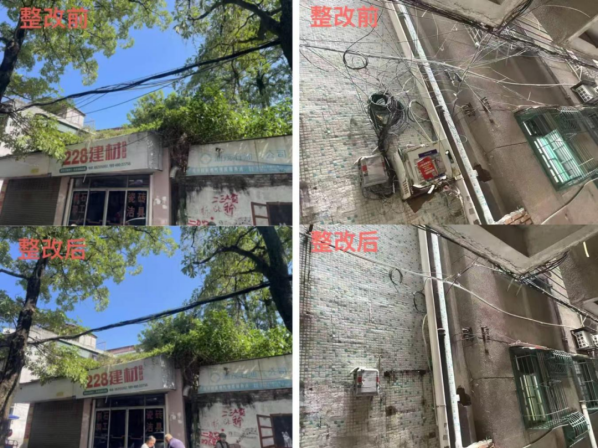 为让新乡“治脉”经验推广到全域,街道迅速吹响全域整治“集结号”,构建“一点突破、全域推进”的良好态势,科学制订“三线”整治专项方案,成功争取到“百千万工程”专项资金支持,落实相关重点社区作为“理脉”责任主体,同步对接电信公司的施工队,深入杏花街、光华路等13条主次干道做全面“体检”,逐一标记跨路飞线、杂乱旧线、老旧电线杆等“经络淤堵点”。随后,对症下药,全面开展飞线落地、清除废线、拆除废旧杆等精准“施治”举措,目前13条主次干道“三线”整治已全部完工,线缆杂乱问题得到显著改善,安全隐患有效化解,街容街貌焕然一新。