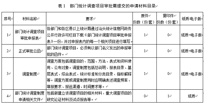 (二)制定统计调查的部门在送《部门统计调查项目审批申报表》的同时,须将实施调查的方案、表式、提供给统计调查对象填报的统计调查表和说明, 包括总说明、报表目录、基层表式、综合表式、统计标准和分类目录、指标解释、逻辑关系及抽样方案等相关文件一并报送政府统计机构审批。