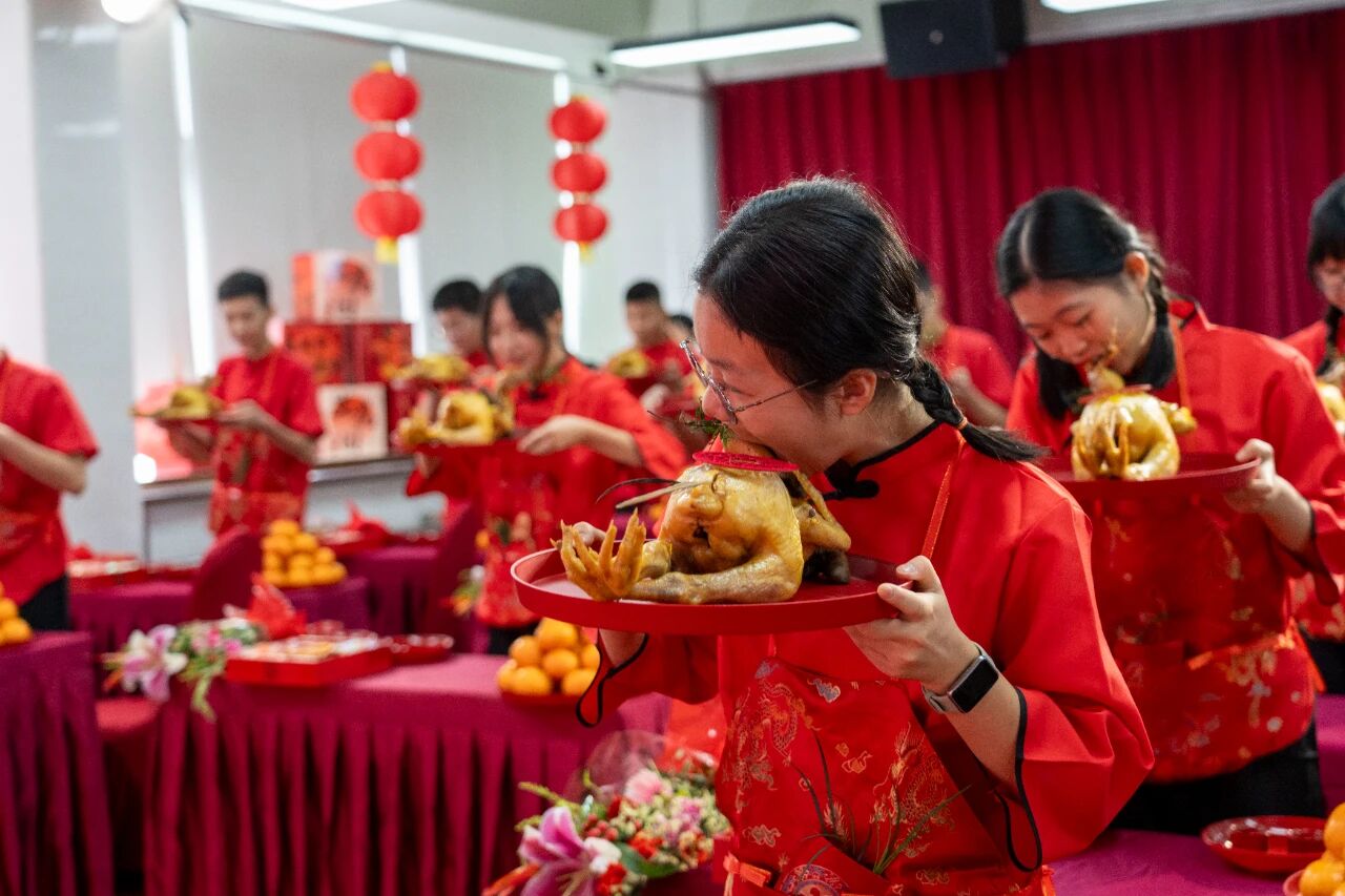 咬凤头:孩子们象征性地咬一下鸡头,象征独占鳌头,出人头地。