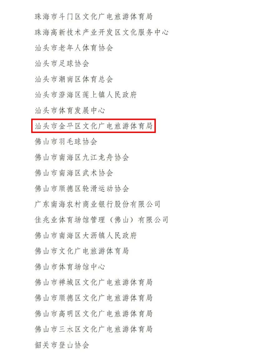 成功承办、协办2023年广东省青少年男子篮球锦标赛、广东省青少年田径(竞走)锦标赛、东楚汕头马拉松等国内金牌赛事,在赛事组织、协调、保障方面表现突出,有力提升了金平区的城市形象和影响力,带动了本地全民健身热潮。