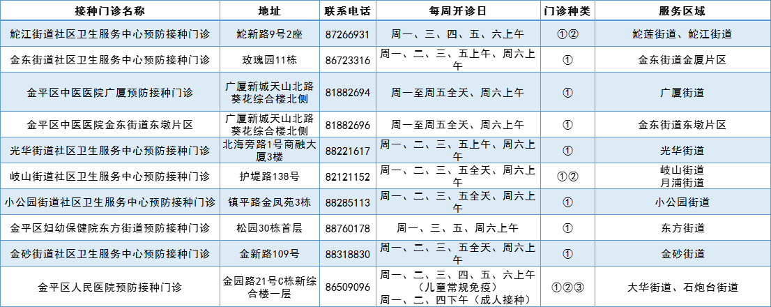 2、预防接种门诊每周开诊时间除有说明外,均为工作日的上班时间,各门诊具体开诊时间可进一步咨询相关预防接种门诊。