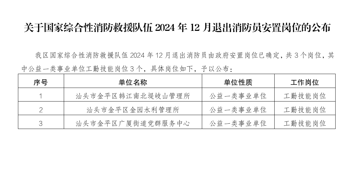 关于国家综合性消防救援队伍2024年12月退出消防员安置岗位的公布