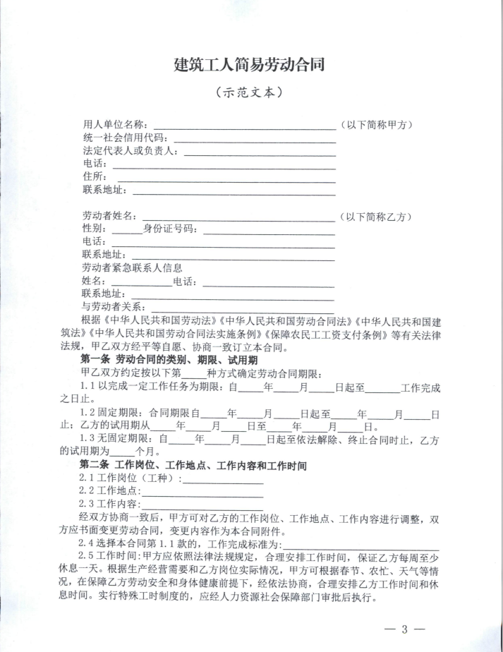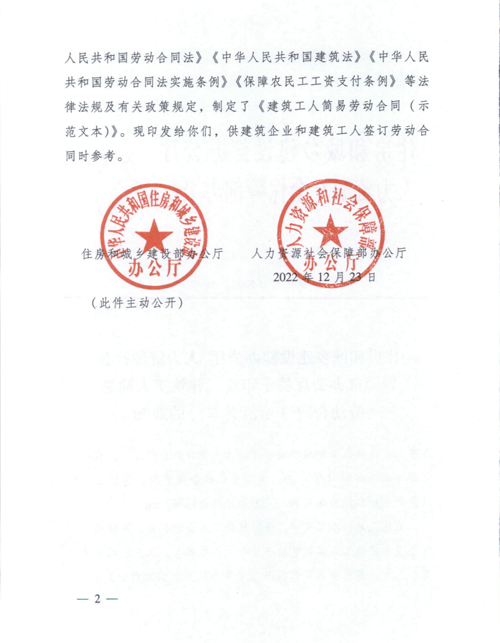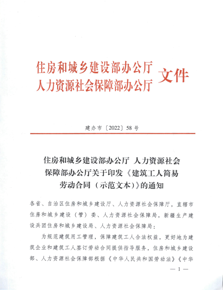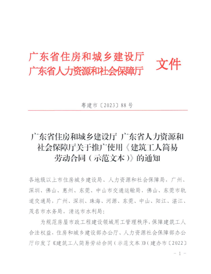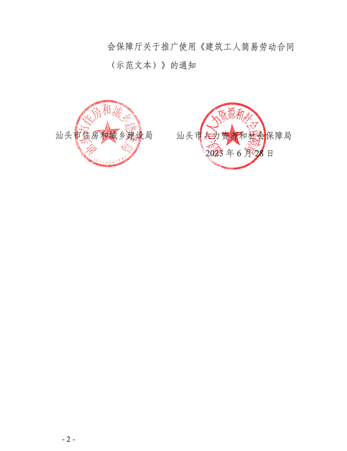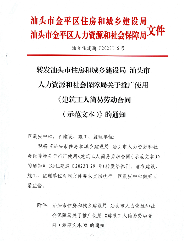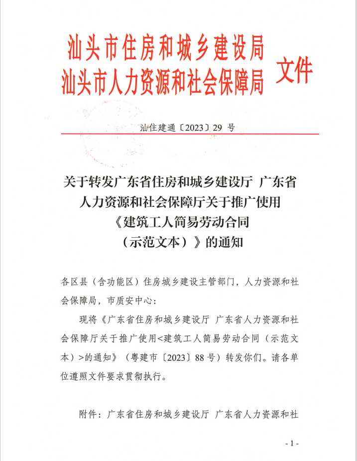 转发汕头市住房和城乡建设局 汕头市人力资源和社会保障局关于推广使用《建筑工人简易劳动合同(示范文本)》的通知