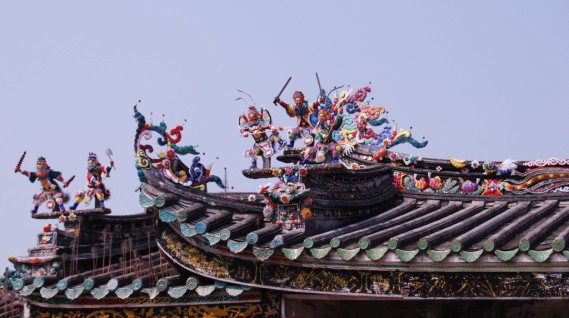 是采用各种釉彩光泽的陶瓷片,经剪取、敲制、镶嵌、黏土粘接、堆砌而成人物、花、鸟、虫、禽、兽、博古、山水等形态,为庙宇、祠堂、照壁和其他一些房屋的一种传统经典建筑装饰工艺,俗称贴饶或扣饶,具有色彩浓艳,质感坚实,久经风雨、烈日曝晒而永不褪色的特点。金平地域内各处天后宫、关公庙和其他宗祠、善堂、庙宇等建筑物大都存此装饰。