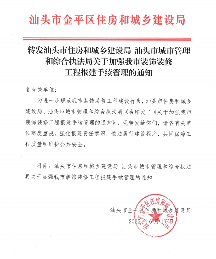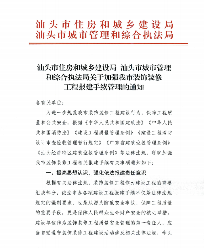 转发汕头市住房和城乡建设局 汕头市城市管理和综合执法局关于加强我市装饰装修工程报建手续管理的通知