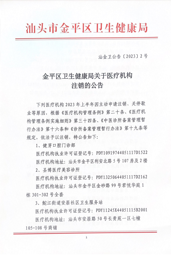 下列医疗机构 2023 年上半年因主动申请注销、关停歌业等原因,根据《医疗机构管理条例》第二十条、《医疗机构管理条例实施细则》 第三十四条,《中医诊所备案管理暂行办法》第十六条和《诊所备案管理哲行办法》 第十九条等规定,依法予以注销,特公告如下: