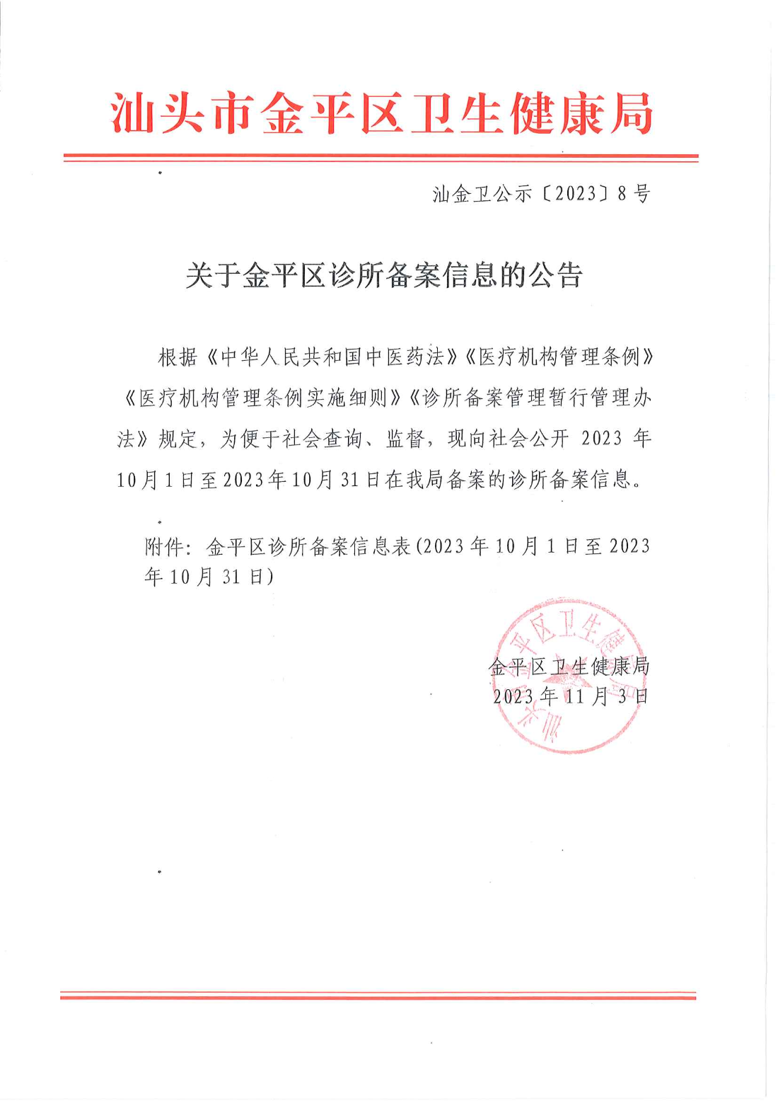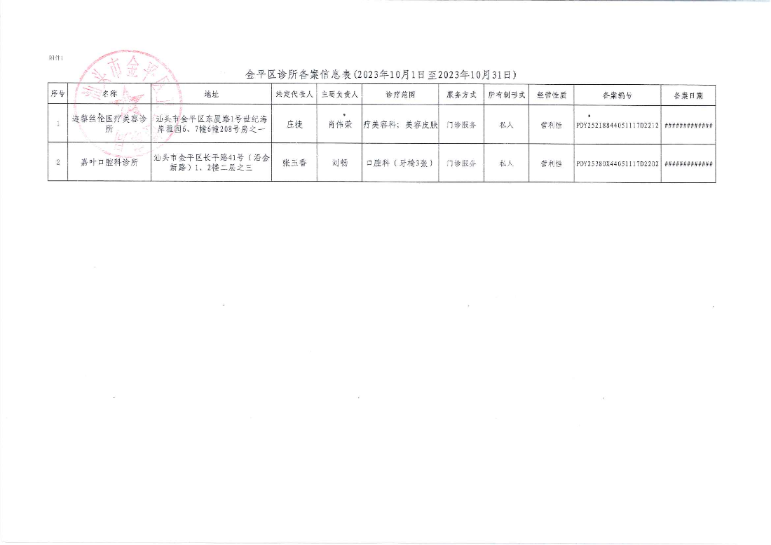 附件:金平区诊所备案信息表(2023年10月1日至2023年10月31日)