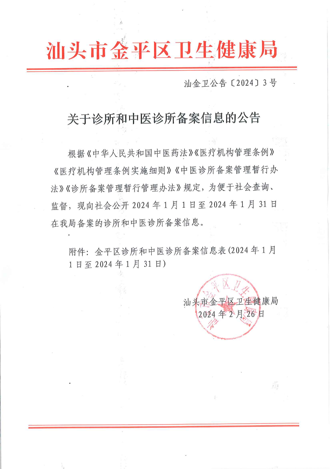 根据《中华人民共和国中医药法》《医疗机构管理条例》《医疗机构管理条例实施细则》《中医诊所备案管理暂行办法》《诊所备案管理暂行管理办法》规定,为便于社会查询、监督,现向社会公开2024年1月1日至2024年1月31日在我局备案的诊所和中医诊所备案信息。