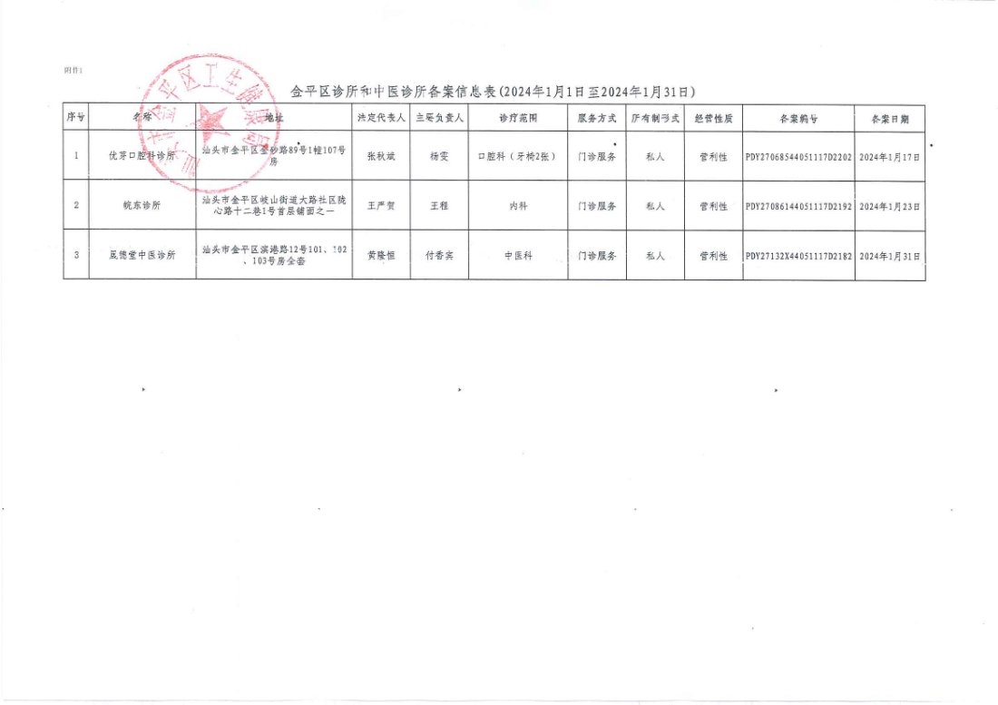 附件:金平区诊所和中医诊所备案信息表(2024年1月1日至2024年1月31日)