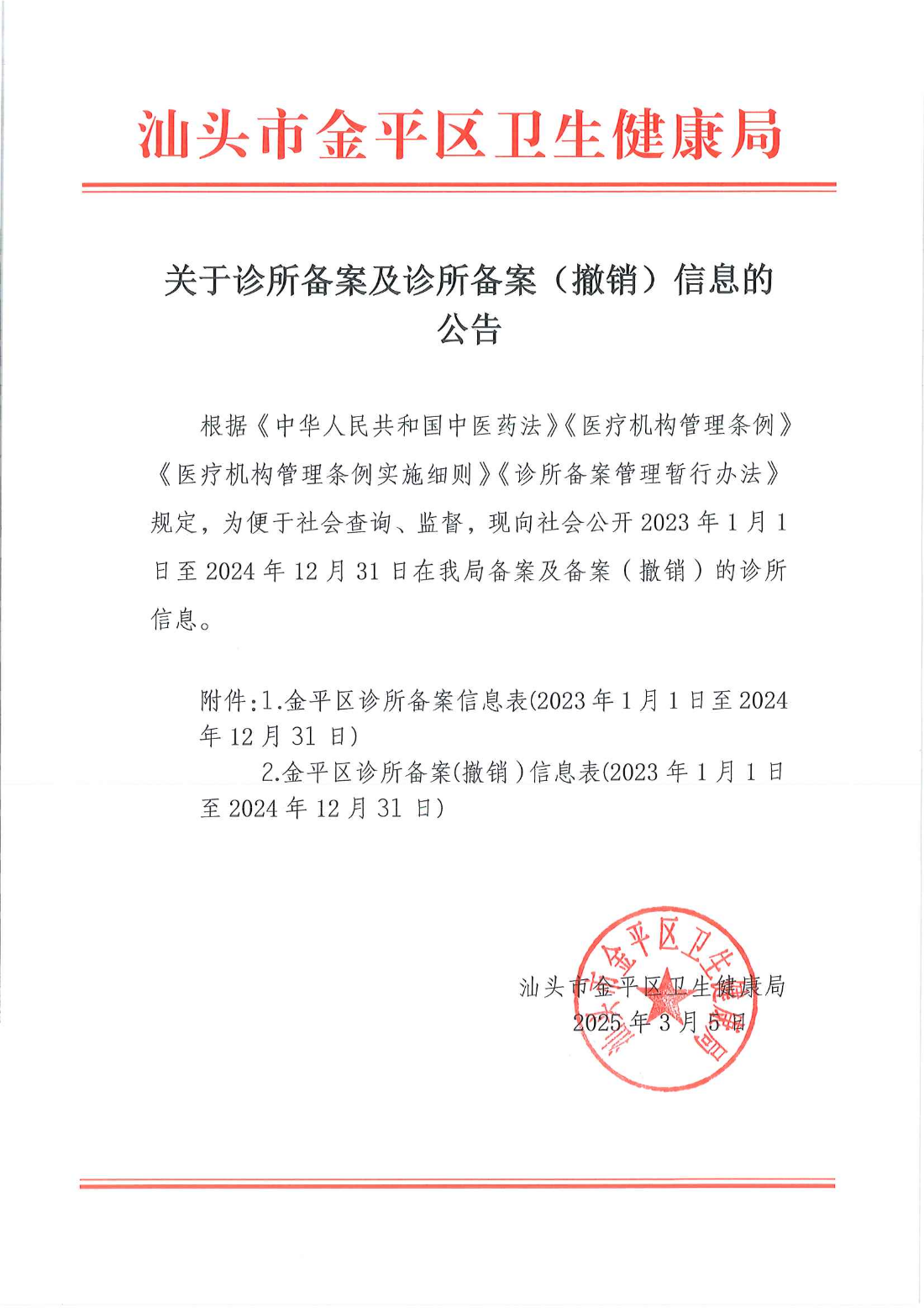 根据《中华人民共和国中医药法》《医疗机构管理条例》《医疗机构管理条例实施细则》《诊所备案管理暂行办法》规定,为便于社会查询、监督,现向社会公开2023年1月1日至2024年12月31日在我局备案及备案(撤销)的诊所信息。