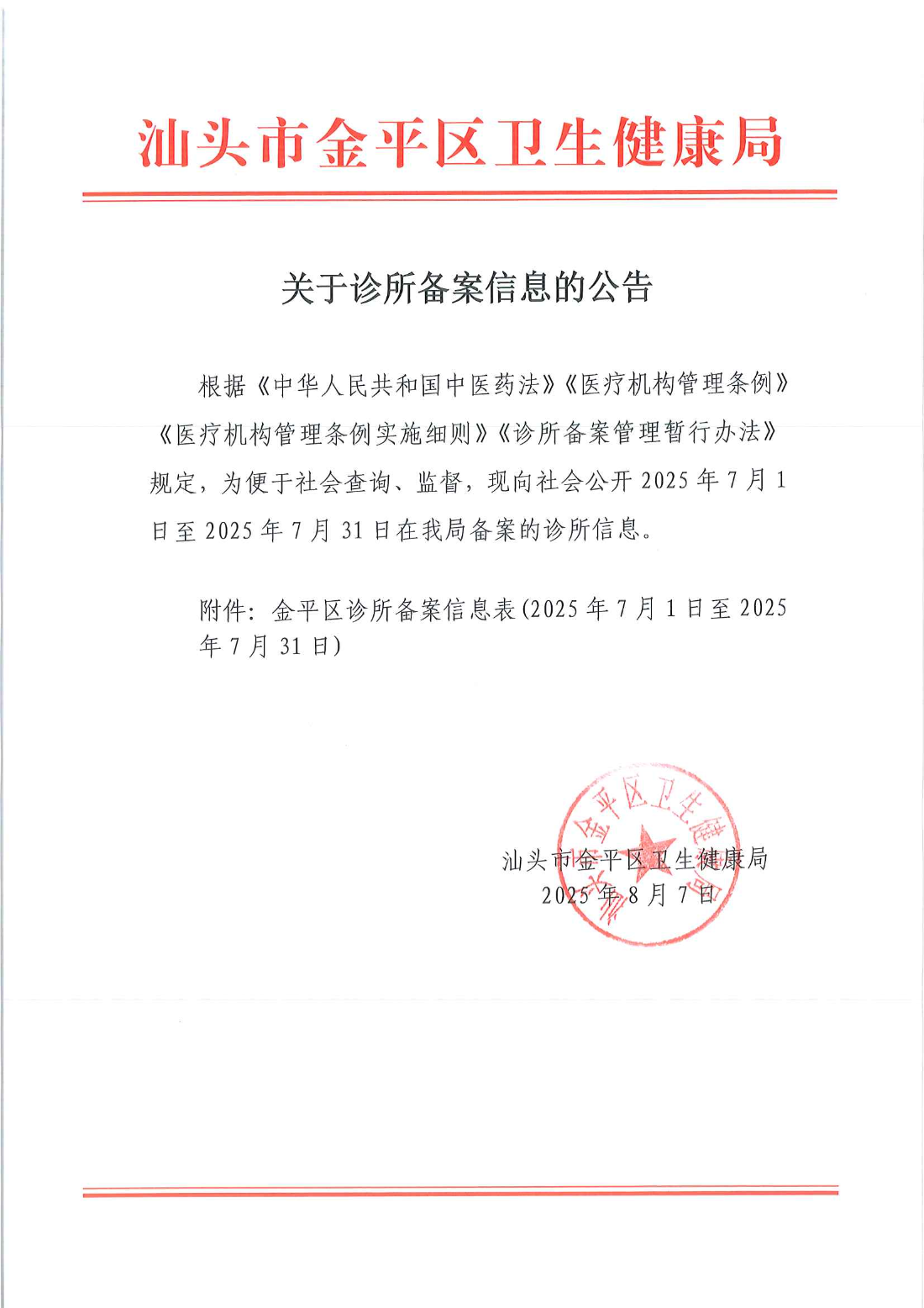 根据《中华人民共和国中医药法》《医疗机构管理条例》《医疗机构管理条例实施细则》《诊所备案管理暂行办法》规定,为便于社会查询、监督,现向社会公开2025年7月1日至2025年7月31日在我局备案的诊所信息。