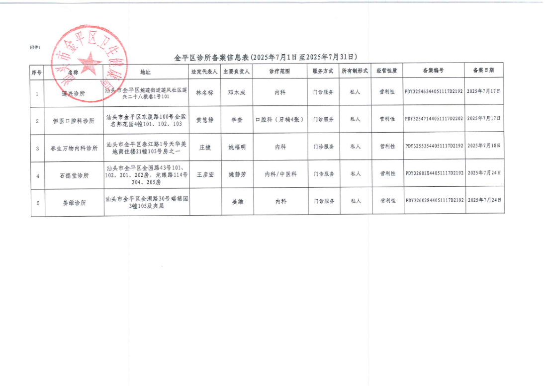 附件:金平区诊所备案信息表(2025年7月1日至2025年7月31日).xlsx