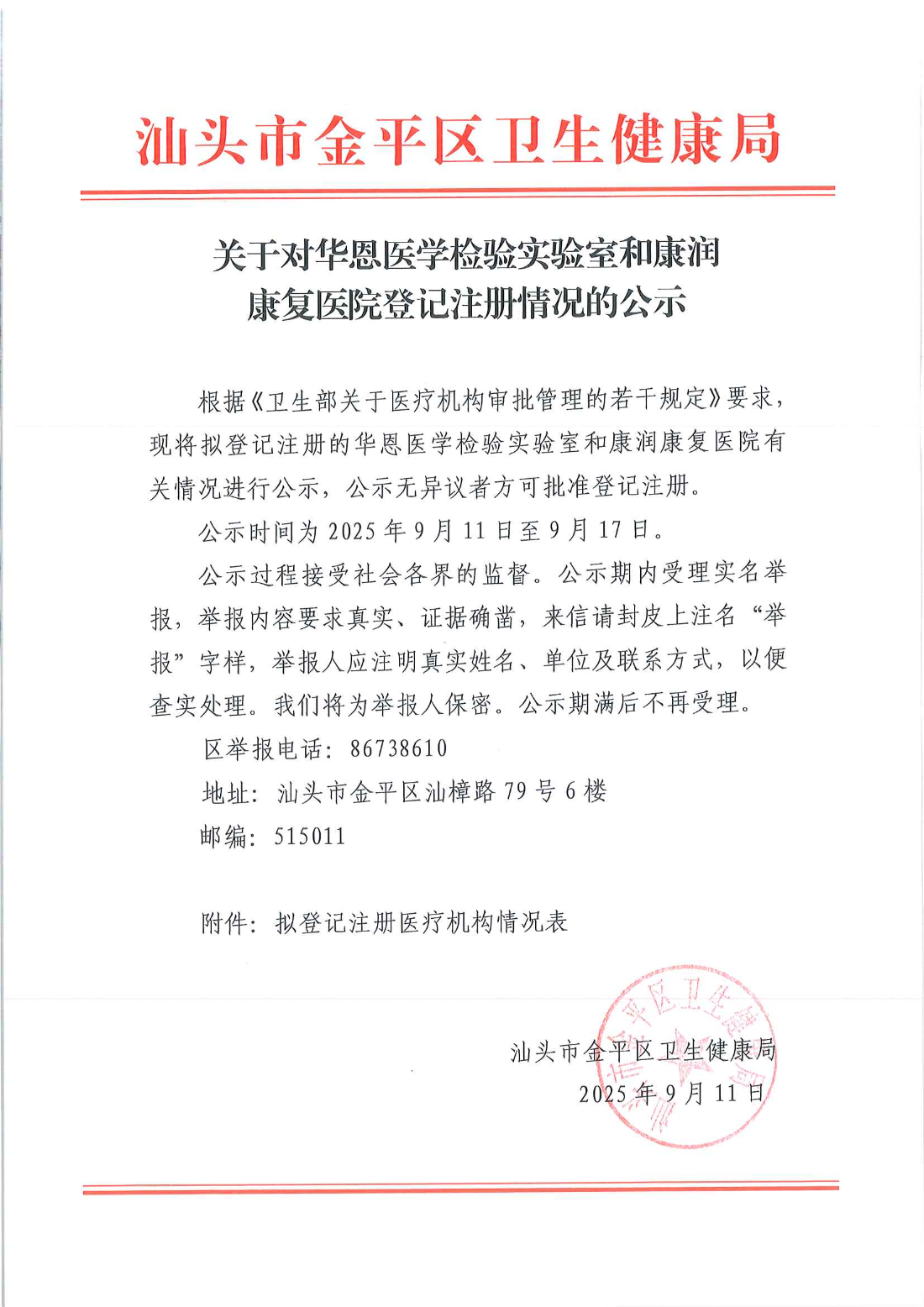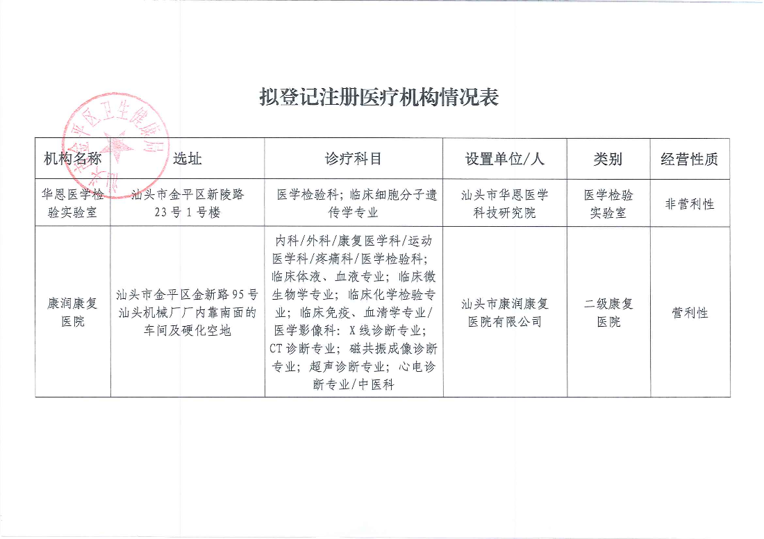 根据《卫生部关于医疗机构审批管理的若干规定》要求,现将拟登记注册的华恩医学检验实验室和康润康复医院有关情况进行公示,公示无异议者方可批准登记注册。